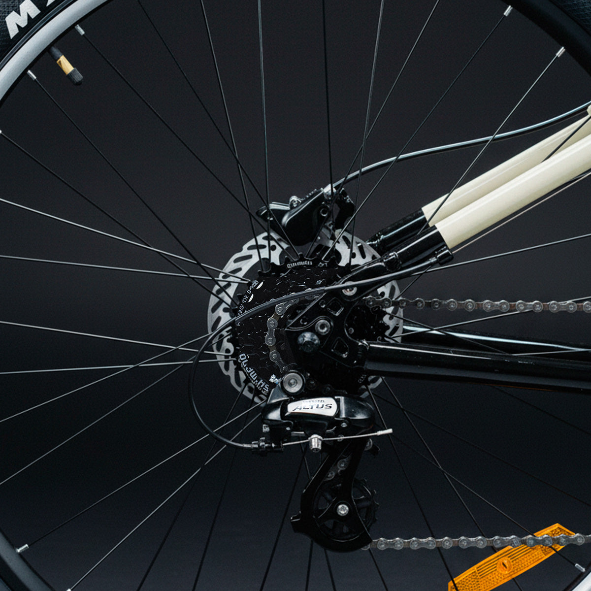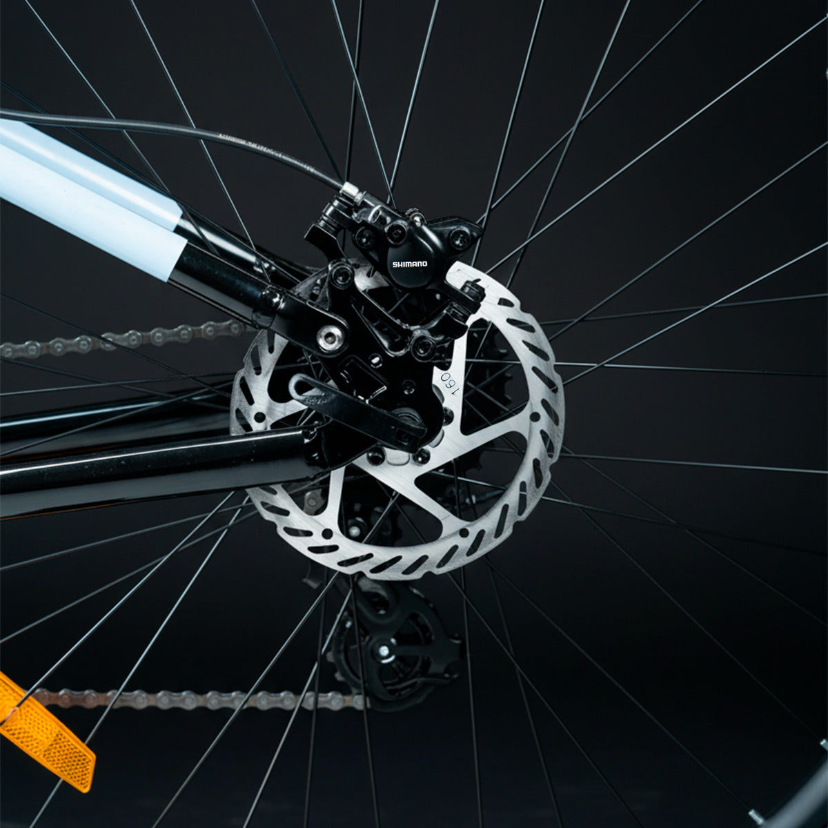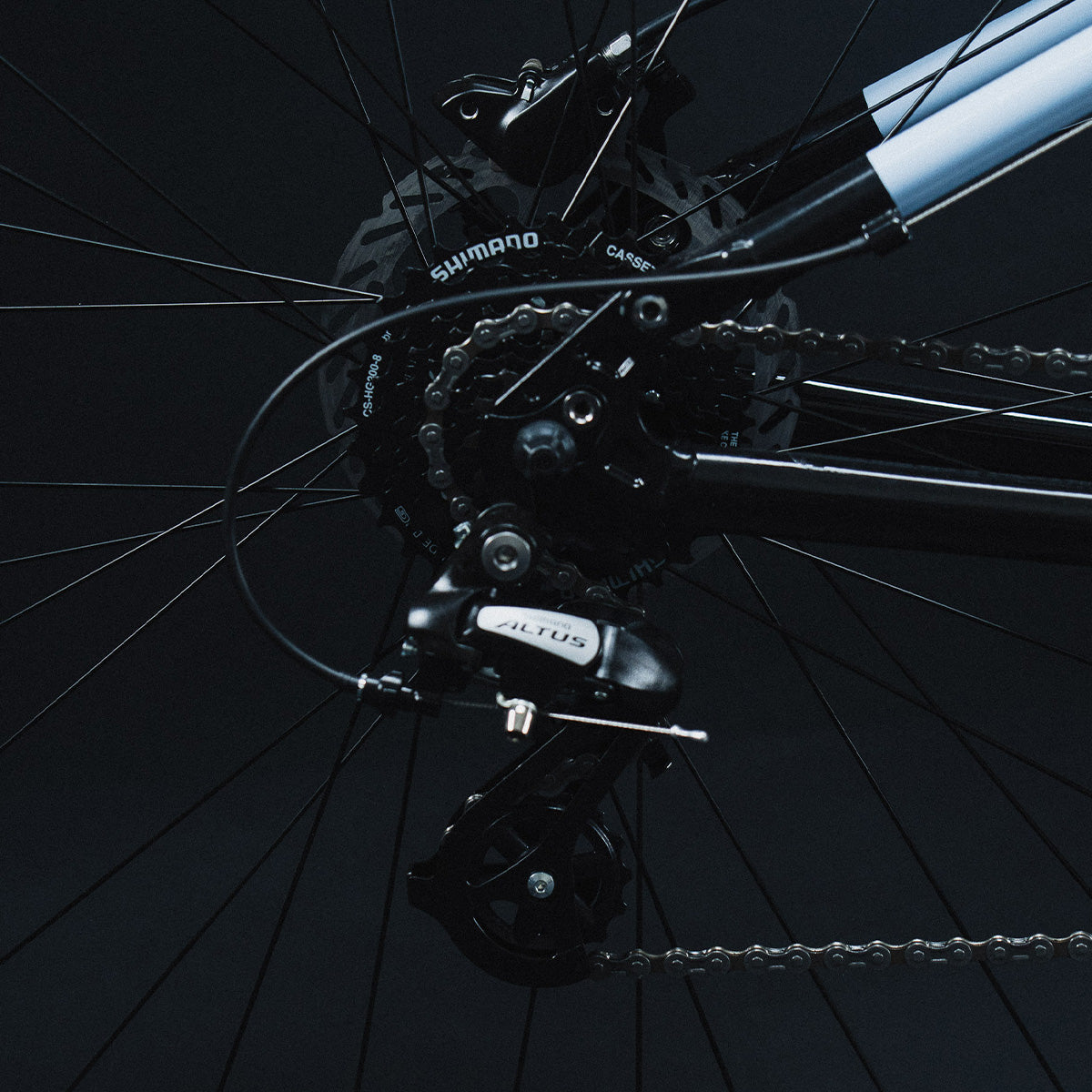 El cassette Shimano CS-HG200-8 (12-32T) brinda una cadencia óptima y cambios suaves para adaptarte a cualquier pendiente. Combinado con la cadena KMC 8S y las palancas Shimano SL-M315, cada pedaleada se siente potente y controlada.