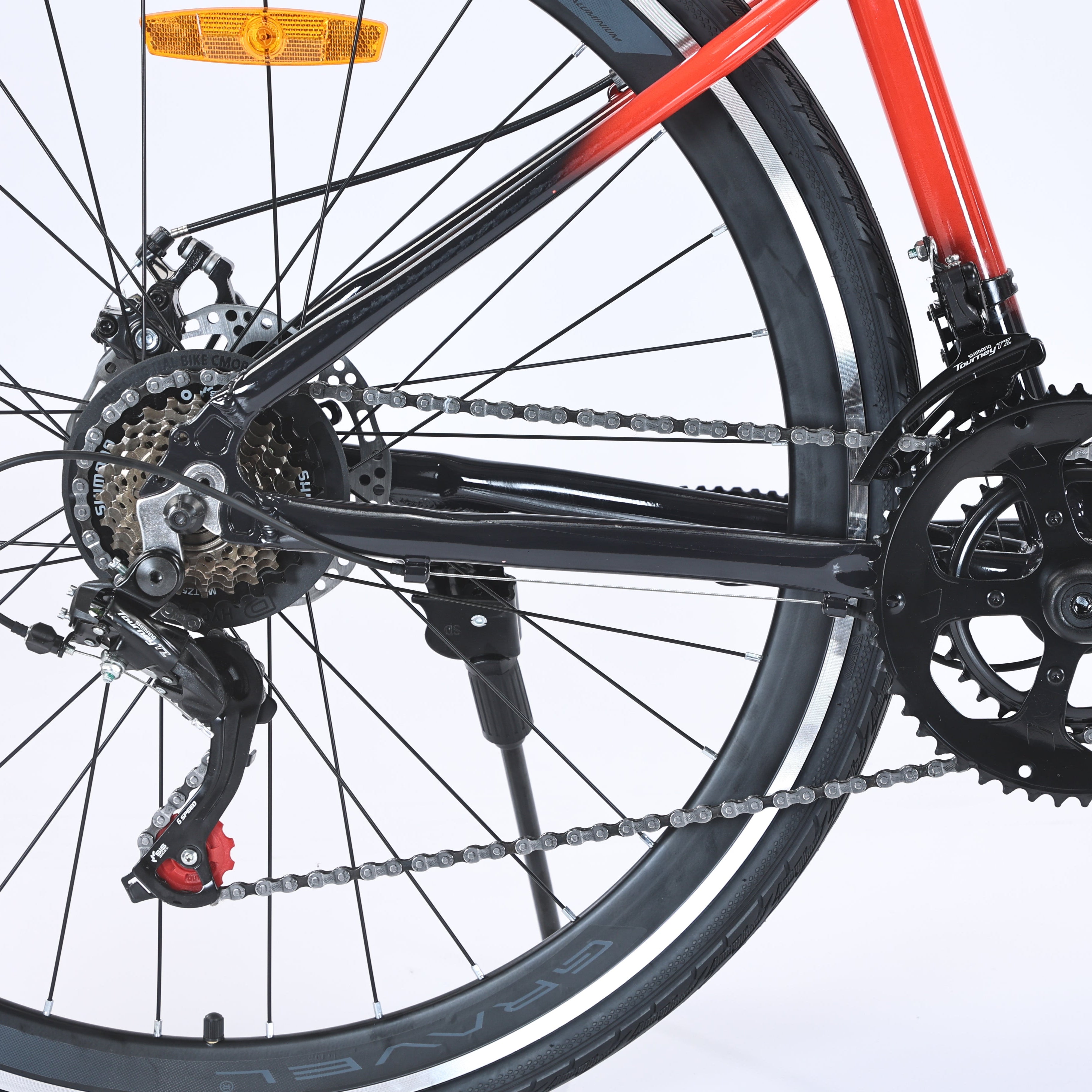 La transmisión Shimano 2x7 te ofrece cambios precisos y un rango ideal para cualquier pendiente. Biplato 50/34T, rueda libre 14-28T y componentes duraderos que responden a cada pedaleada.