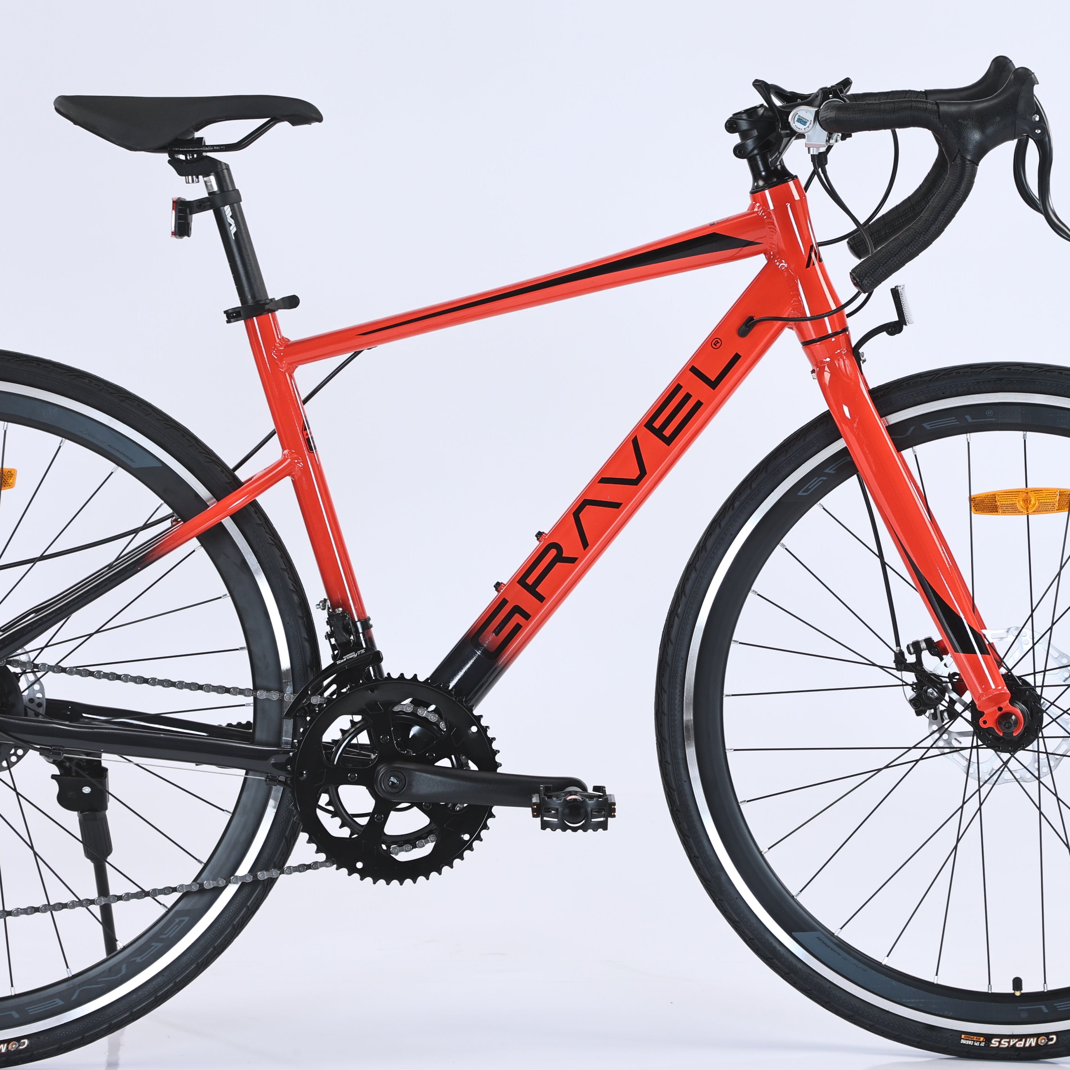 Rodada Compass 700x35C, rines de doble pared y mazas de liberación rápida te ofrecen seguridad en todo tipo de terrenos. A esto se suman los frenos de disco mecánico, manubrio de aluminio y sillín antiprostático Rival, que te brindan comodidad y precisión en cada trayecto.