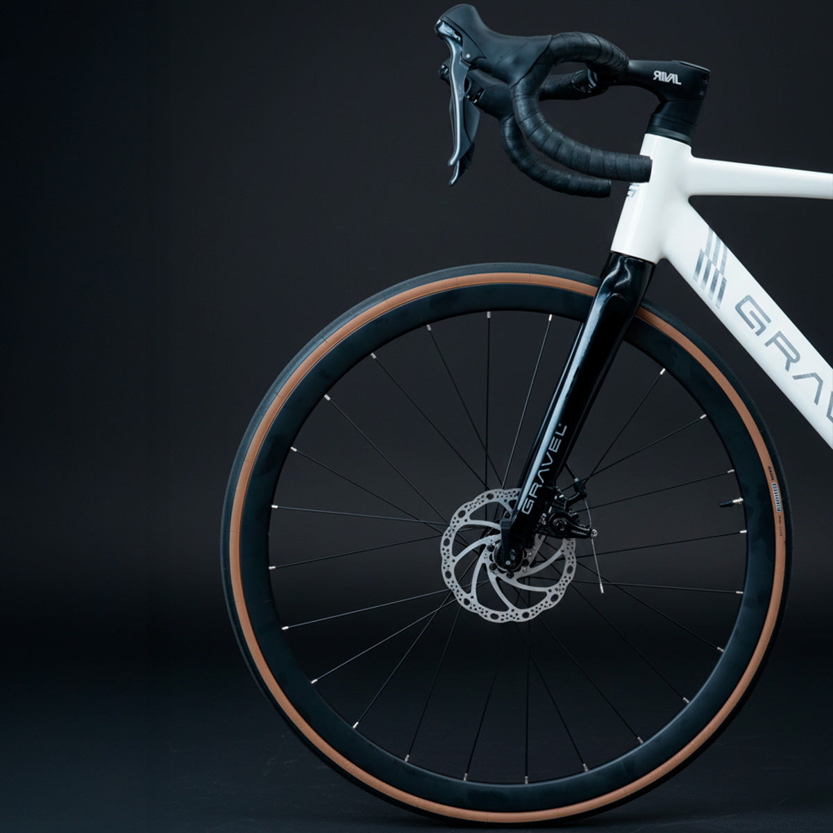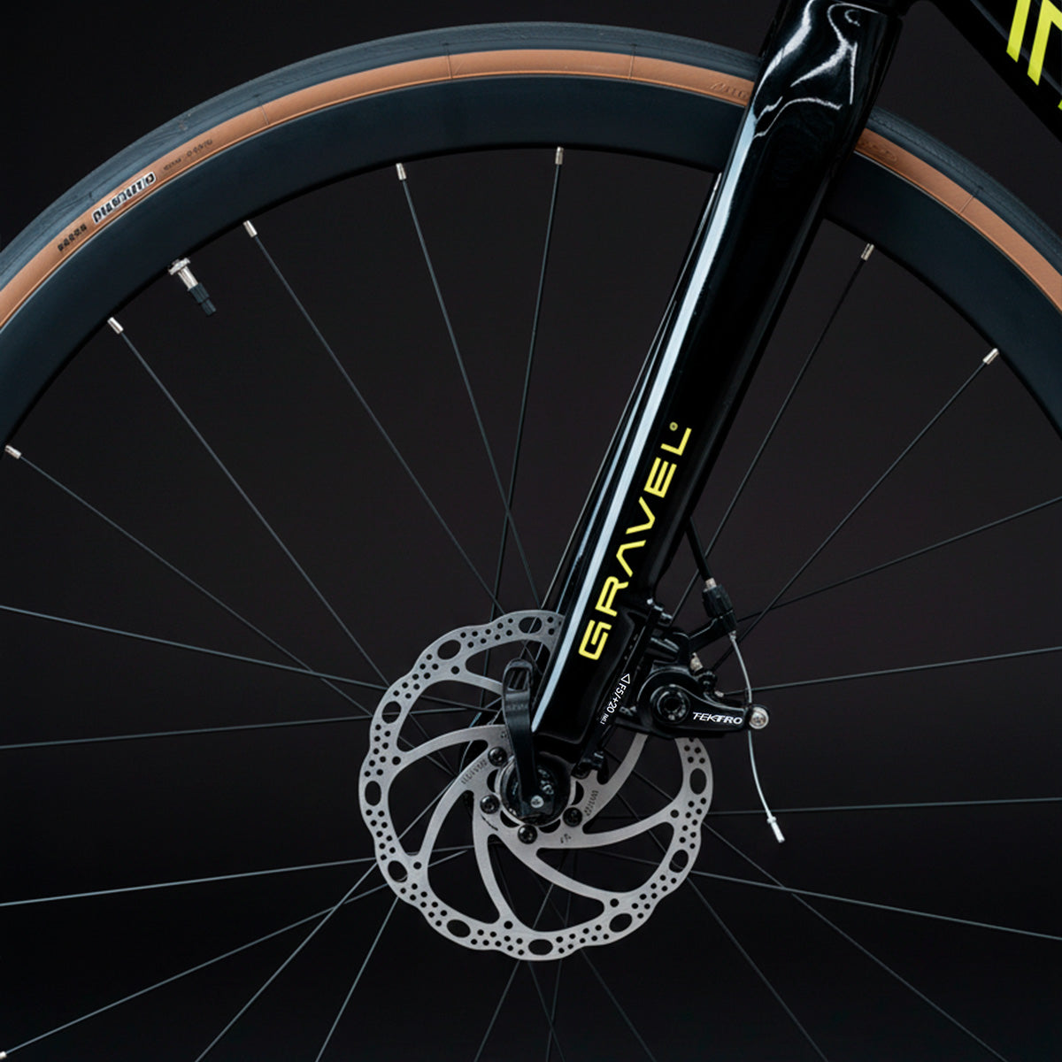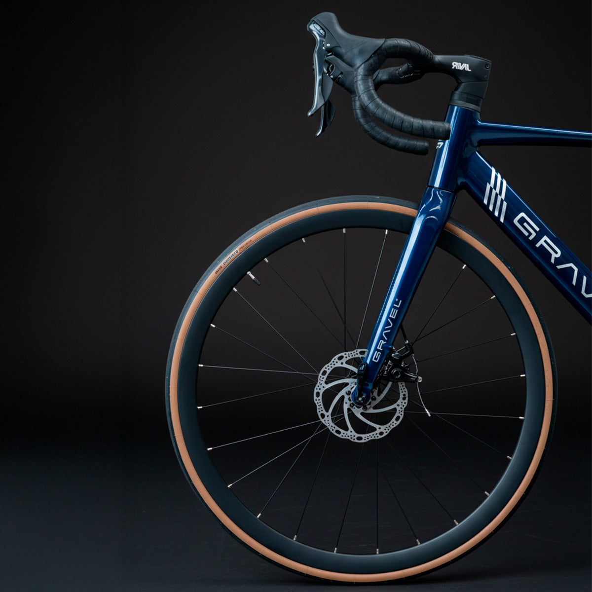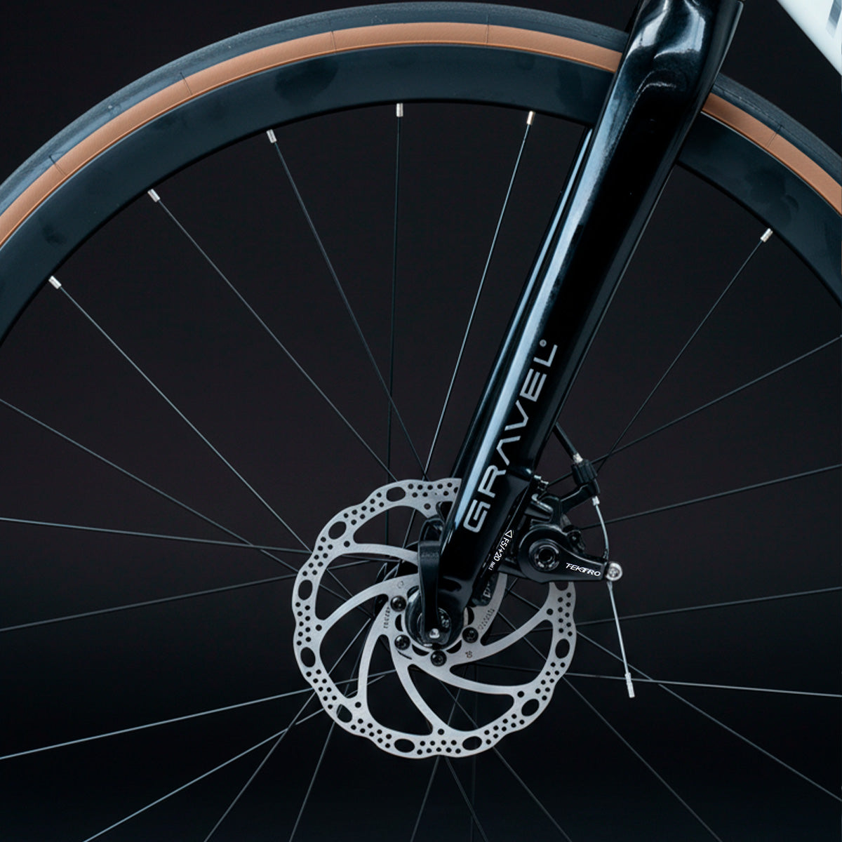 Mazas de aluminio para Gravel con sistema flip flop; delanteras de 100x140 mm y traseras de 120x175 mm, para una conducción adaptable y resistente.