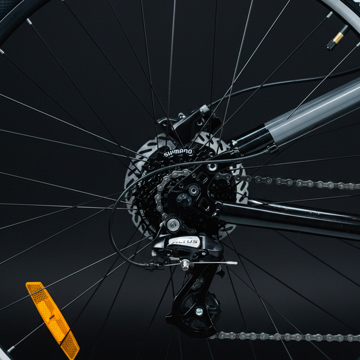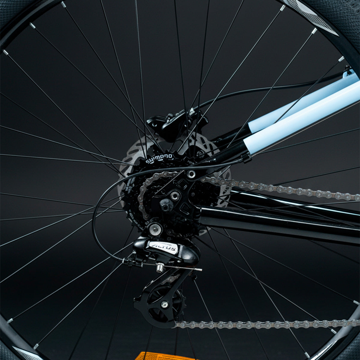 El cassette Shimano CS-HG200-8 (12-32T) brinda una cadencia óptima y cambios suaves para adaptarte a cualquier pendiente. Combinado con la cadena KMC 8S y las palancas Shimano SL-M315, cada pedaleada se siente potente y controlada.