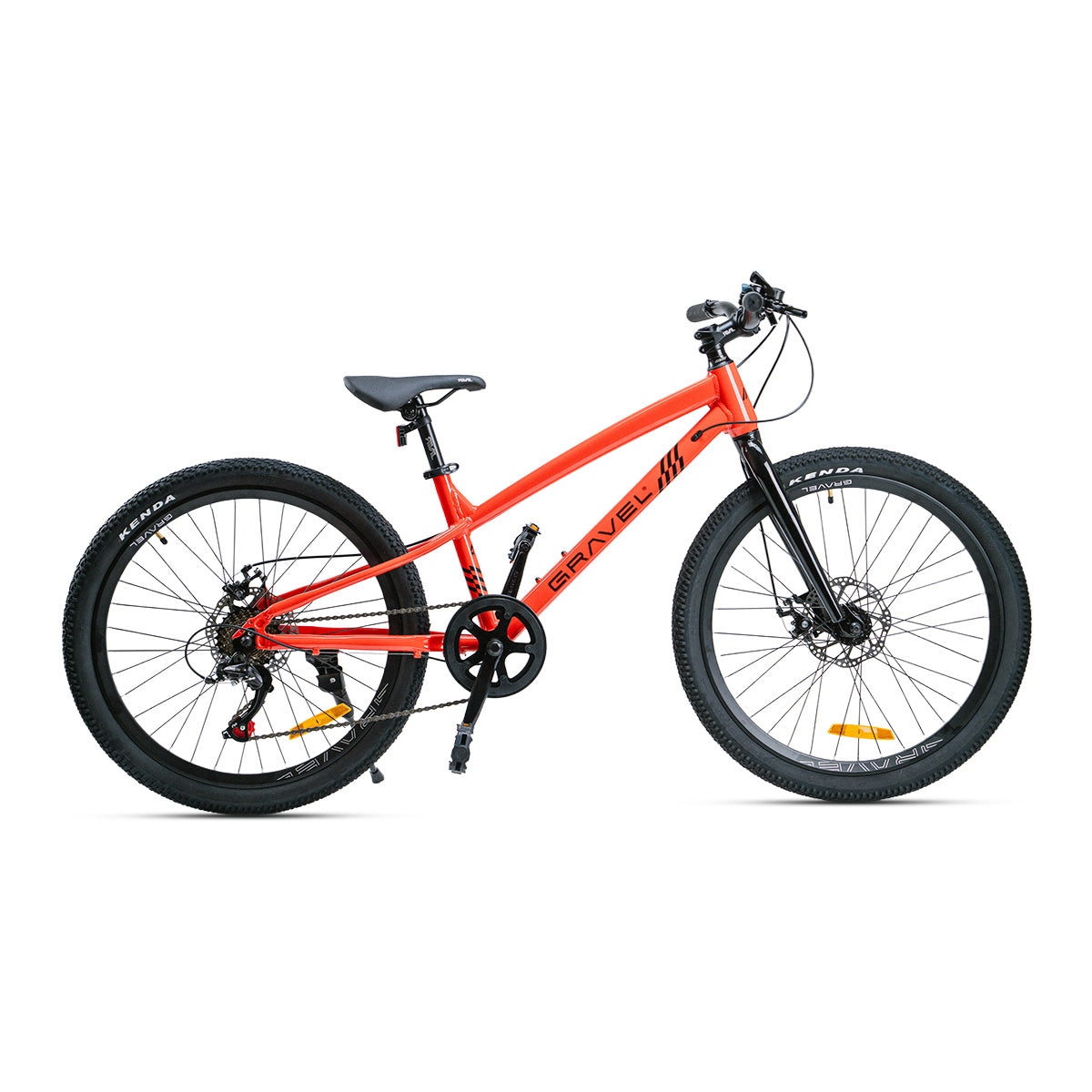 Las llantas de 24" con neumáticos Kenda ofrecen tracción excepcional, mientras que la suspensión GRAVEL J-TRA asegura un viaje suave. Los frenos de disco mecánico brindan un frenado confiable y control total en descensos y terrenos desafiantes.